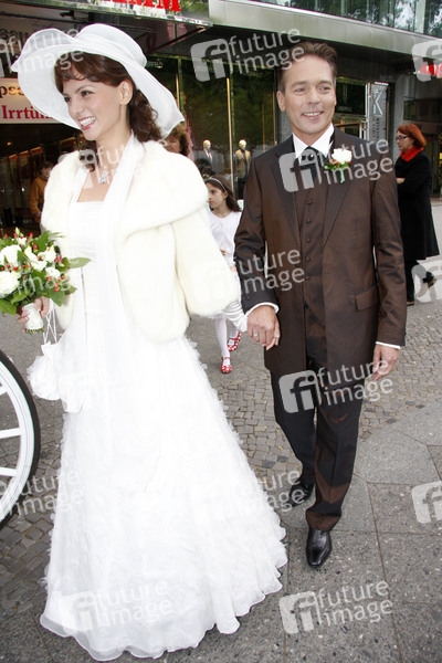 Das Brautpaar Jacques Breuer und Viola Wedekind mit der Hochzeitskutsche unterwegs vom Theater am Kurfürstendamm zur Hochzeitsfeier im Hotel Seehof