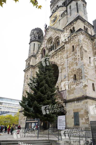 Aufstellung einer 17 Meter hohen Nordmanntanne für den Weihnachtsmarkt auf dem Breitscheidplatz vor der Kaiser-Wilhelm-Gedächtnis-Kirche. Berlin, 02.11.2021