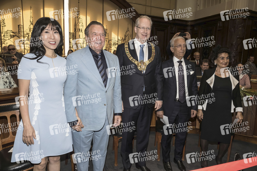 Schröder-Kim So-yeon, Gerard Schröder, Stefan Schostok, Madrid Samii und Mashid Samii beim Empfang zum 75. Geburtstag von Ehrenbürger und Bundeskanzler a.D. Gerhard Schröder im Neuen Rathaus. Hannover, 24.04.2019