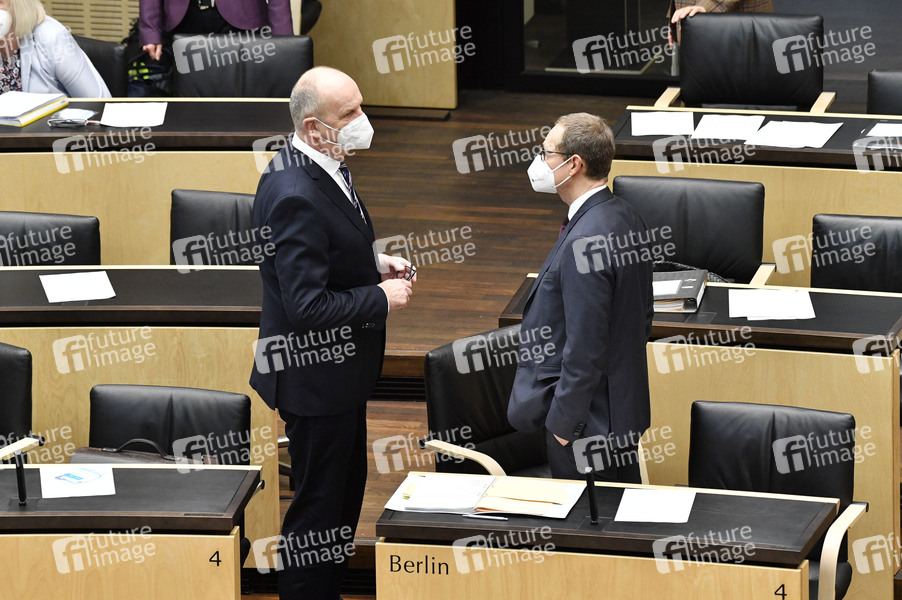 Dietmar Woidke und Michael Müller in der 1000. Sitzung des Deutschen Bundesrates im Bundesrat. Berlin, 12.02.2021