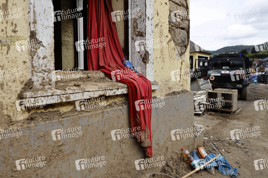 Nach dem Jahrhunderthochwasser in der Eifel durch heftige Regenfälle und Dauerregen mit Überschwemmungen und Überflutungen haben die Aufräumarbeiten im Ahrtal große Fortschritte gemacht. Einheiten von Polizei, THW, Bundeswehr und Feuerwehr mitsamt vielen freiwilligen Helfern haben Straßen geräumt, Schutt und Schlamm entfernt und die Menschen versorgt. Der Wiederaufbau wird trotzdem Jahre dauern. Im Bild Flutschäden in der Ortschaft Mayschoß, in der die Flut viele Häuser zerstörte, 08.08.2021
