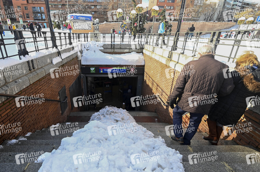 Metrostation Ventas - Die Region Madrid nach dem Sturmtief Filomena, das in weiten Teilen Spaniens mit starken Schneefällen für Chaos sorgte. Starker Schneefall legte das öffentliche Leben nahezu lahm. Seit 50 Jahren hatte es nicht so geschneit. Madrid, 10.01.2021