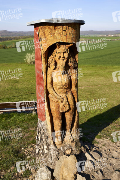 Teufelsstatue nahe dem Hamburger Wappen an der Felsformation Teufelsmauer. Timmenrode, 08.05.2021