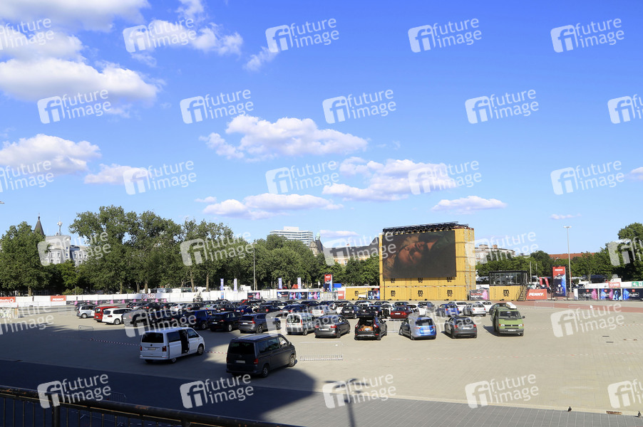 Zuschauer bei der Aufführung des Films 'Tschick' im Autokino Bewegte Zeiten auf dem Heiligengeistfeld. Hamburg, 21.6.2020
