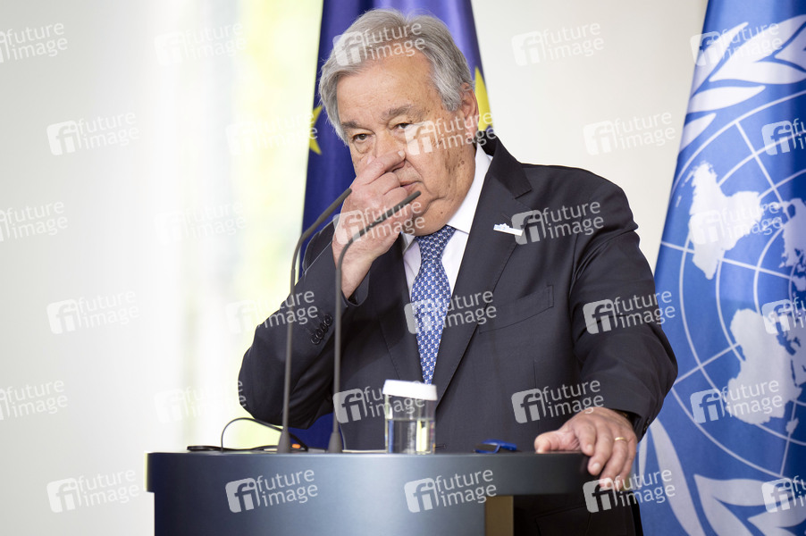 Antonio Guterres beim Empfang des Generalsekretärs der Vereinten Nationen zu einem gemeinsamen Gespräch mit dem Bundeskanzler mit anschließendem Pressestatement im Bundeskanzleramt. Berlin, 14.05.2025