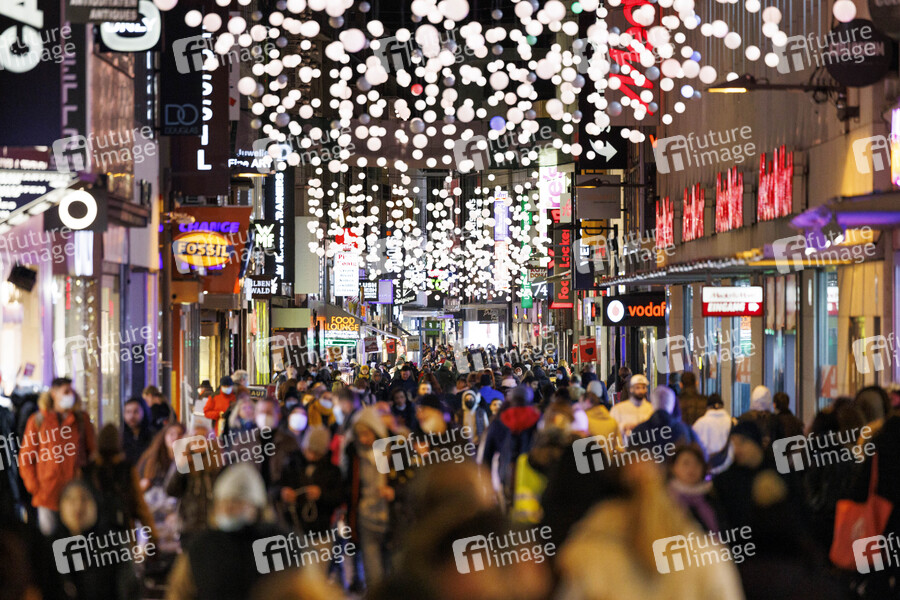 Passanten streifen durch die von Weihnachtsbeleuchtung gesäumte Hohe Straße in Köln. Viele Verbraucher erledigen bereits jetzt ihre Weihnachtseinkäufe, um dem Problem international verzögerter Lieferketten zu entkommen. Wegen Corona wid eine Ausweitung der 2G-Regel auf den Einzelhandel derzeit diskutiert. (Themenbild, Symbolbild) Köln, 01.12.2021