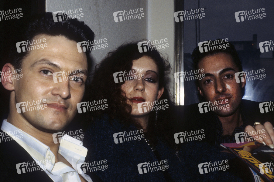 Robert Shaw, Maggie De Monde und Rick P. Jones von Swans Way bei einem Interviewterim bei Universal Records. London, 06.03.1984