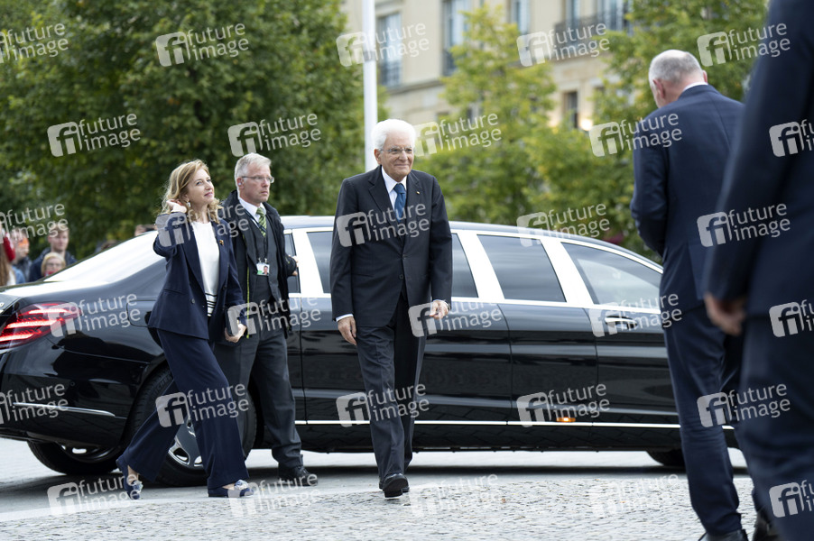 Laura Mattarella, Sergio Mattarella und Kai Wegner beim Empfang des Präsidenten der Italienischen Republik zum gemeinsamen Gang in Richtung Brandenburger Tor. Berlin, 27.09.2024