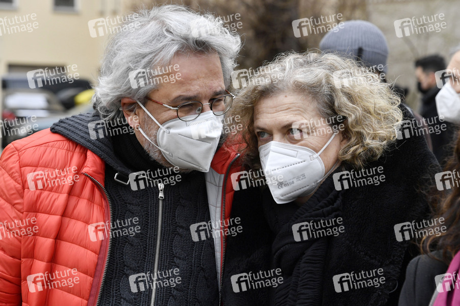 Can Dündar mit Ehefrau Dilek Dündar bei der Pressekonferenz des KulturForum TürkeiDeutschland zur Solidarität mit den gesamten demokratischen Kräften in der Türkei, insbesondere mit inhaftierten Schriftsteller*innen, Künstler*innen, Journalist*innen, Gewerkschafter*innen und Politiker*innen vor dem Maxim Gorki Theater. Berlin, 23.03.2021