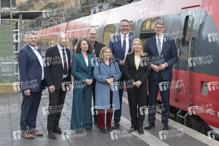 Stefan Gleißner, Gerd-Dietrich Bolte, Cornelia Weigand, Thorsten Müller, Katrin Eder, Alexander Schweitzer, Evelyn Palla bei der Inbetriebnahme der neuen Ahrtalbahn mit Sonderfahrt von Dernau nach Altenahr. Altenahr, 12.12.2025