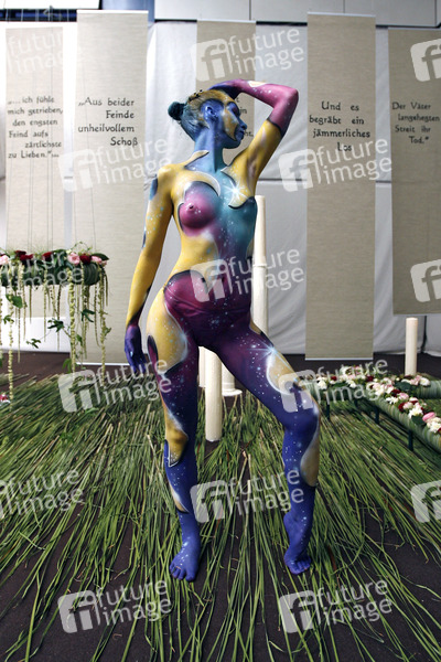 Bodypainting und Fotoshooting mit Model Sarah am Tag der offenen Tür der Meisterschule Justus-von-Liebig-Schule, Abteilung Floristik in Hannover-Ahlem. Künstler: Jörg Düsterwald