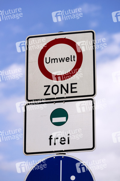 Ein Umweltzonen-Schild in Köln. Die Kölner Umweltzone umfasst linksrheinisch die innerstädtischen Stadtteile bis zum Militärring sowie Müngersdorf, Junkersdorf, Lövenich, Weiden und Niehl. (Themenbild, Symbolbild) Köln, 26.02.2021