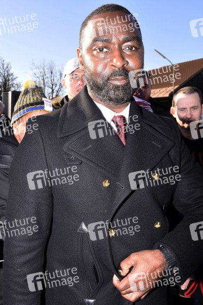 Andy Cole bei der Grundsteinlegung für eine Gedenkvitrine zum 62. Jahrestag des Flugzeugunglücks am damaligen Flughafen München-Riem, bei dem 23 Menschen ums Leben kamen, darunter acht Fußballspieler von Manchester United, am Manchesterplatz. München, 06.02.2020