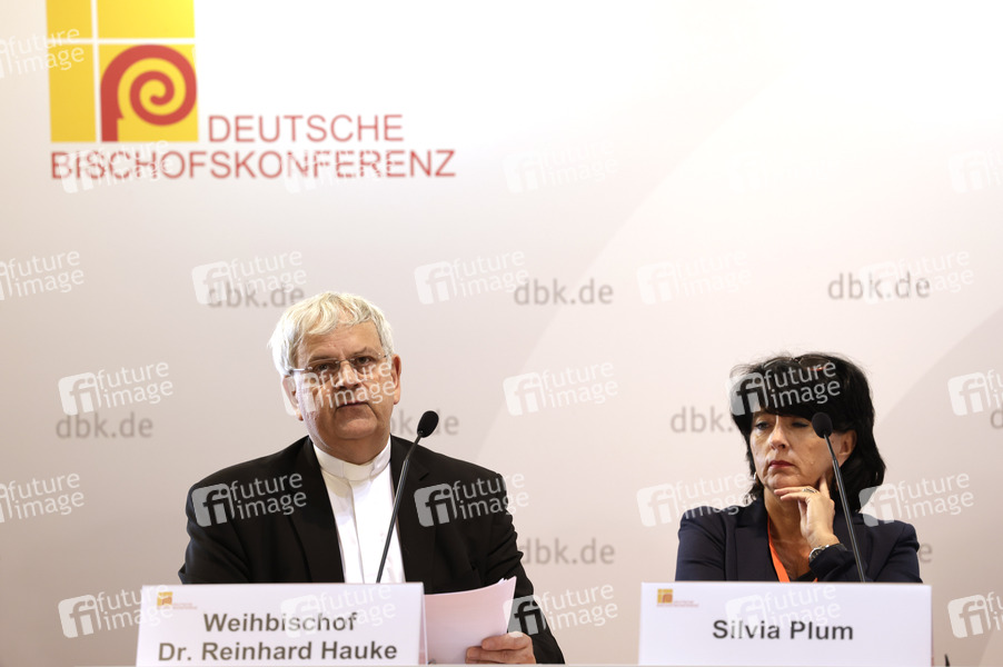 Reinhard Hauke und Silvia Plum beim Pressegespräch zum Thema 'Ein Jahr nach der Flut: Kirchliche Aufbauhilfe, Notfallseelsorge und der Einsatz für die Menschen' im Rahmen der Vollversammlung der Deutschen Bischofskonferenz im Dompfarrzentrum. Fuöda, 27.09.2022