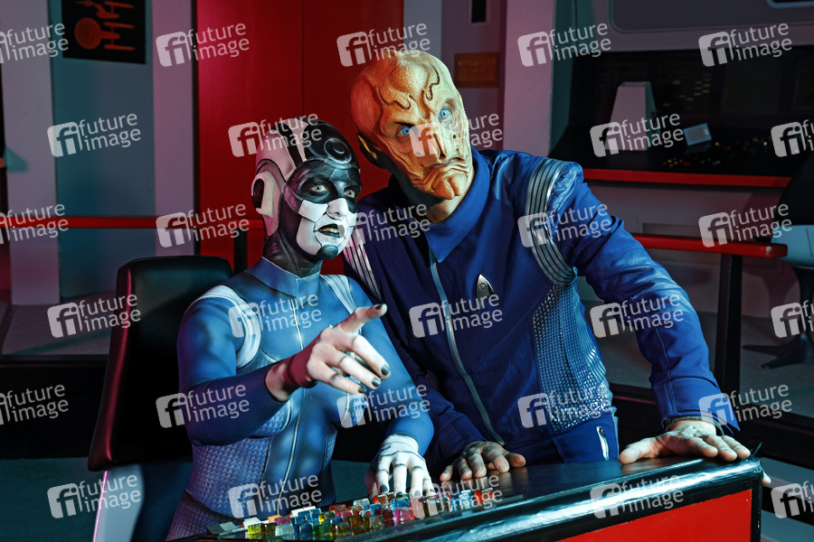 GEEK ART - Bodypainting meets SciFi, Fantasy and more: 'Star Trek Discovery' Photoshooting mit Model Barbara Wegener als Airiam und Enrico Lein als Saru auf der Brücke vom Raumschiff Enterprise im Filmwelt Center. Bad Münder, 18.04.2019 - Ein Projekt des Fotografen Tschiponnique Skupin und des Bodypainters und Transformakers Enrico Lein