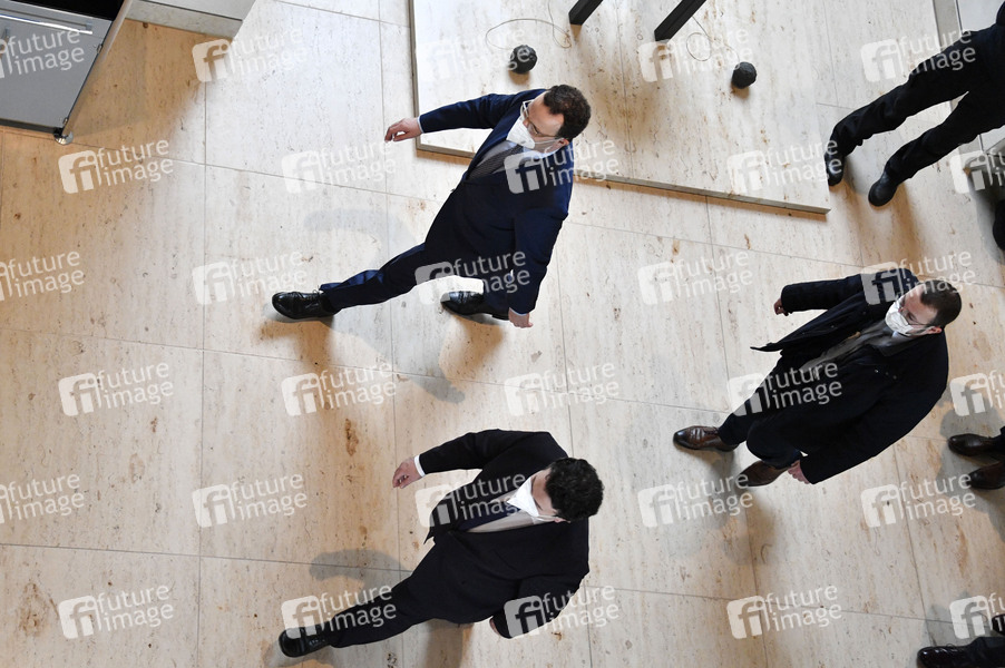Gesundheitsminister Jens Spahn und Arbeitsminister Hubertus Heil beim Pressestatement zur Verteilung von FFP2-Masken an Hartz-IV-Empfänger am Rande der 206. Sitzung des Deutschen Bundestages in der Westlobby, dem Aufenthaltsbereich vor dem Plenarsaal auf der Westseite im Reichstagsgebäude. Berlin, 28.01.2021