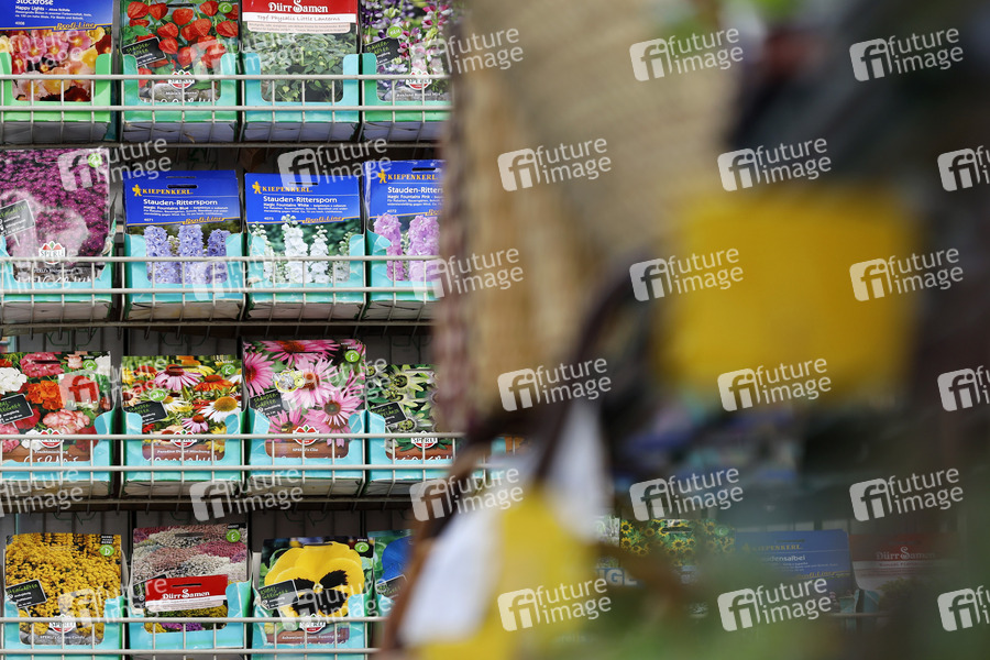 Ein Regal mit Saattüten an einem Floristengeschäft. (Themenbild, Symbolbild) Bonn, 28.04.2021