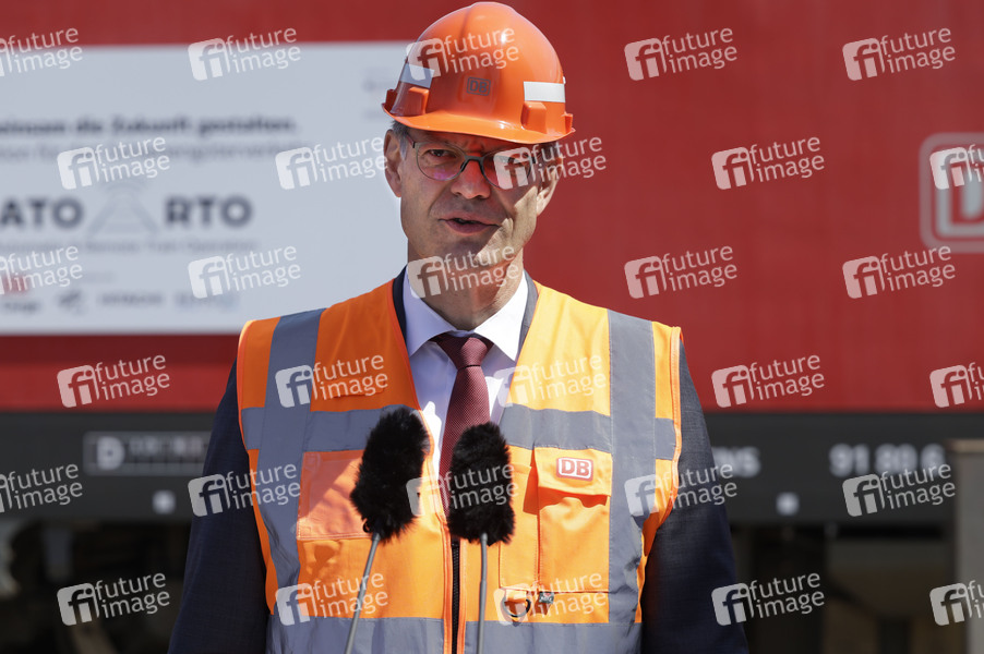 Patrick Schnieder bei der Vorstellung der ersten Güterzuglokomotive, die für den automatisierten Streckenbetrieb umgerüstet wurde im DB Cargo-Werk Köln-Gremberg. Köln, 04.07.2025