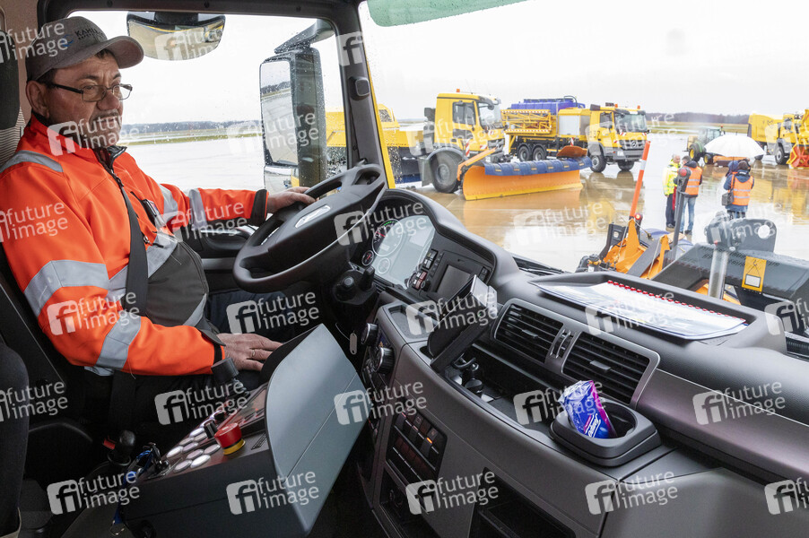 Im Schneeräumfahzeug beim Presse-Fototermin zum Winter-Fuhrpark des Flughafens Köln Bonn Airport. Köln, 11.12.2019