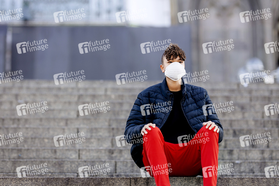 Eine Passantin posiert mit Atemschutzmaske auf der Domtreppe. Köln, 18.03.2020
