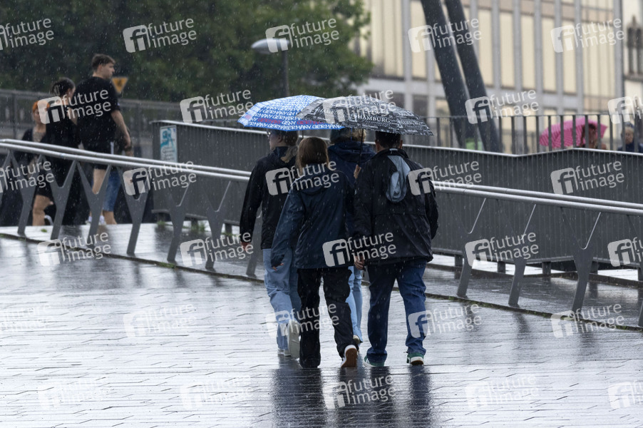 Starke Regenfälle und Gewitter sorgen diesen Sommer vermehrt für Unwetterwarnung: Touristen mit Regenschirmen unterwegs im Regen an den Landungsbrücken im Hafen. Hamburg, 14.08.2024