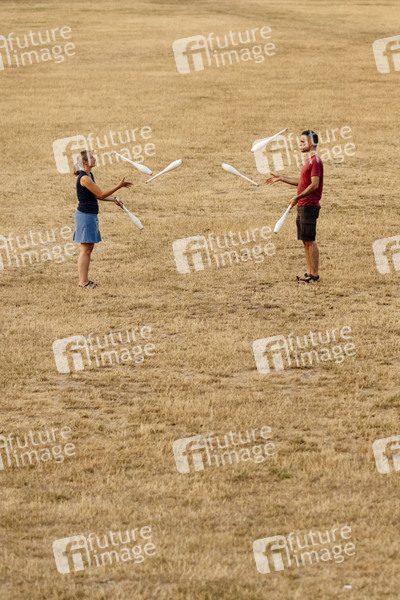 Jongleure auf einer verdorrten Wiese im Rheinpark. Köln, 25.07.2019
