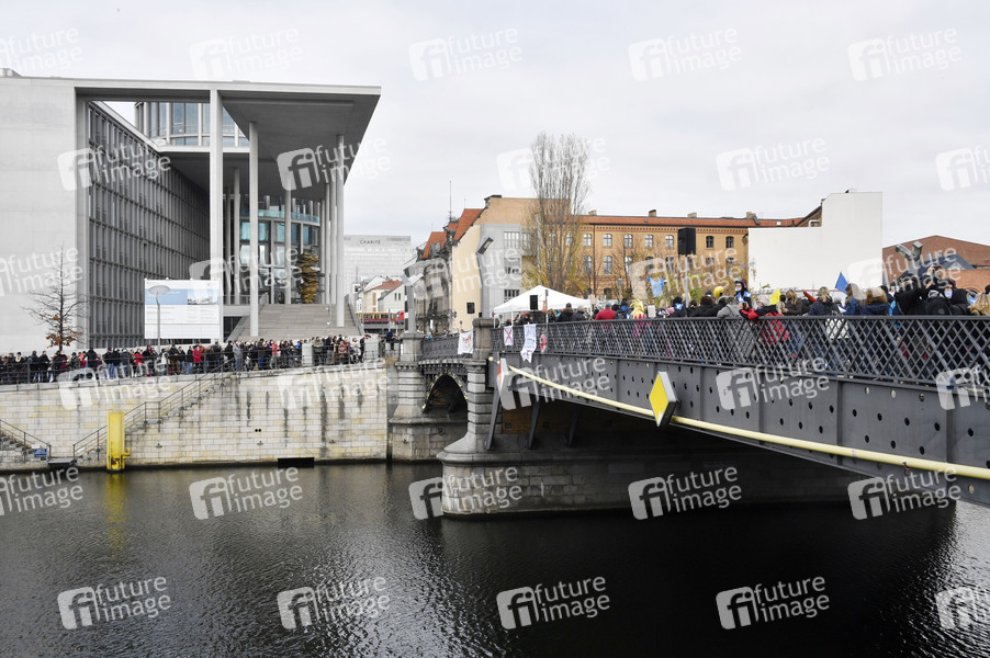 Tausende Demonstranten protestieren am Brandenburger Tor und im Regierungsviertel gegen die Corona-Politik der Regierung. Wegen der massenhaften Verstöße gegen die Hygieneauflagen droht die Polizei mit Auflösung der Versammlung. Das Gelände vor dem Bundestag ist abgesperrt, dort sind Proteste verboten. Berlin, 18.11.2020