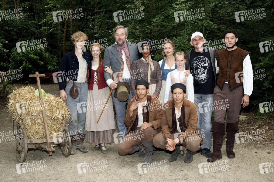 Justus Czaja, Valeria Sophie Körfer, Stephan Grossmann, Fabio Lopes, Dennenesch Zoude, Stefanie Stappenbeck, Frida Brandenburg, Dennis Lopes, Dominique Horwitz und Sandro Fioravanti beim Pressefototermin am Set des Märchenfilms 'Das Märchen vom goldenen Taler' für die ARD-Märchenreihe 'Sechs auf einen Streich' im Museumsdorf Düppel. Berlin, 08.07.2020