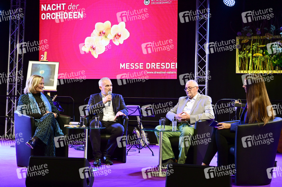 Suzanne von Borsody, Markus Kluge, Bernd Treder und Kristin Hardt bei der feierlichen Taufe einer neuen Orchideenzüchtung bei der Nacht der Orchideen während der Ostermesse Dresdner Ostern in der Messe Dresden. Dresden, 28.03.2025