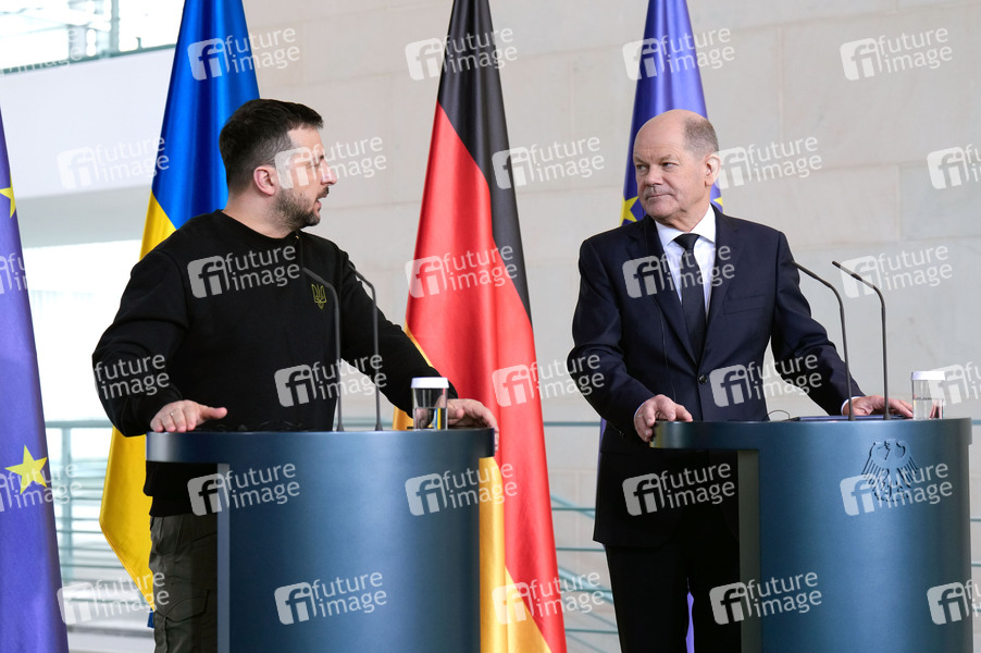 Wolodymyr Selenskyj und Olaf Scholz beim Empfang des Präsidenten der Ukraine zu einem gemeinsamen Gespräch mit dem Bundeskanzler und anschließendem Pressestatement im Bundeskanzleramt. Berlin, 16.02.2024