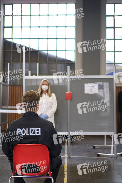 Start der Impfungen für Einsatzkräfte aus den geschlossenen Einsatzeinheiten der Zentralen Polizeidirektion Niedersachsen (ZPD) in der Tannenbergallee. Hannover, 04.03.2021