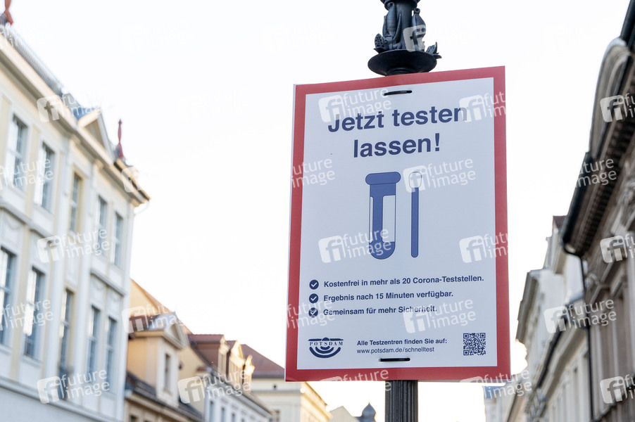 Ein Hinweisschild mit der Aufforderung, sich auf Corona testen zu lassen, hängt in der Fußgängerzone der Flaniermeile Brandenburger Straße. In Potsdam ist das Einkaufen in Verkaufsstellen des Einzelhandels seit Samstag, 27. März 2021, nur noch mit einem aktuellen negativen Corona-Test möglich. (Symbolbild, Themenbild) Potsdam, 29.03.2021