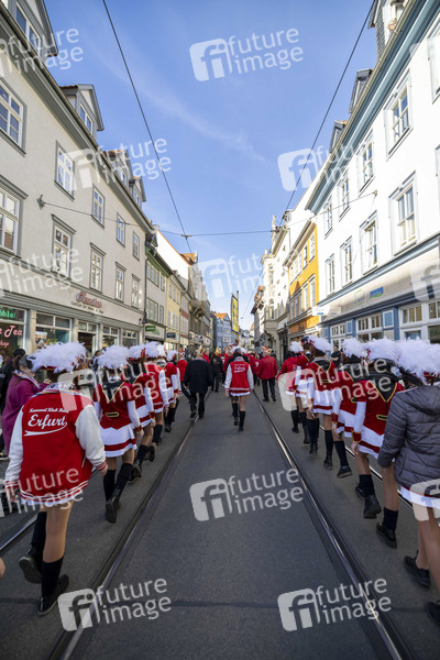 Die Tanzgarden beim Start des Erfuter Karnevals mit einem Mini-Umzug von ca. 2000 Erfurter Karnevalisten vom Hotel Radisson Blu über den Anger zum Fischmarkt vors Rathaus. Erfurt, 11.11.2022