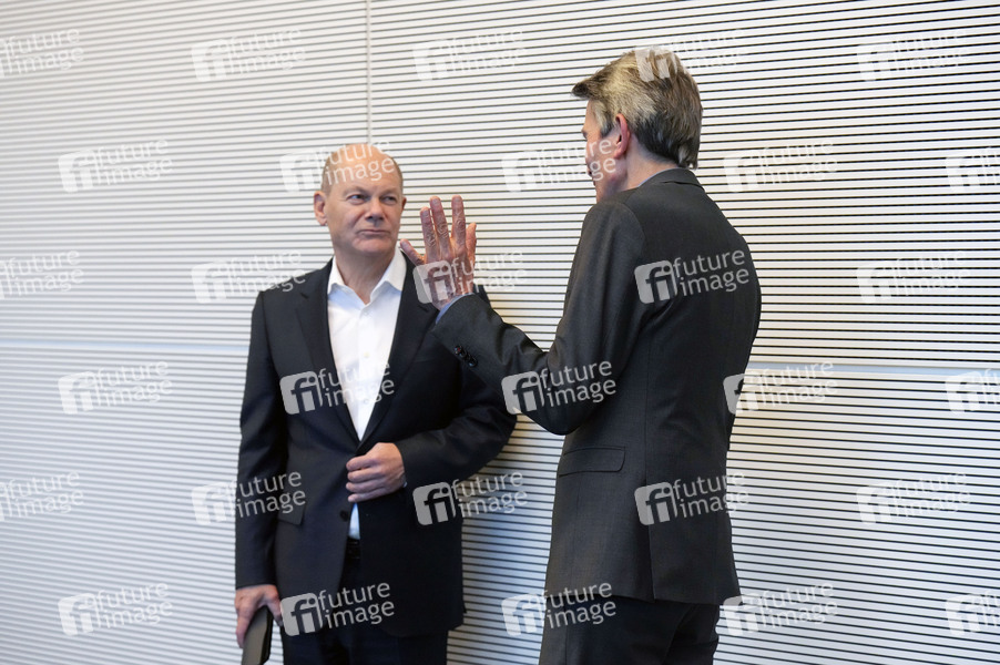 Olaf Scholz und Rolf Mützenich bei der Fraktionssitzung der SPD-Bundestagsfraktion im Reichstagsgebäude. Berlin, 15.10.2024