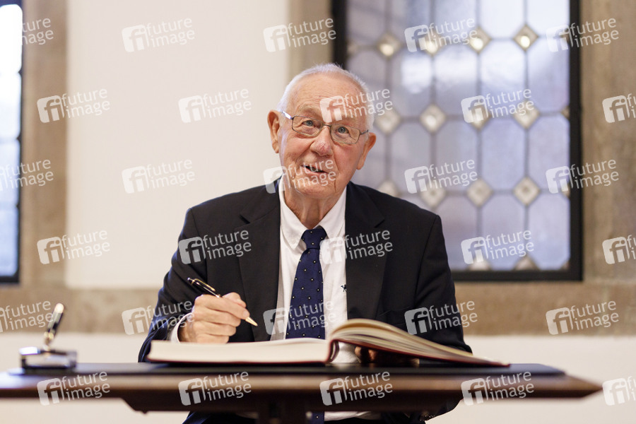 Armin Maiwald beim Eintrag ins Gästebuch - Oberbürgermeisterin Henriette Reker ehrt den Vater der 'Sendung mit der Maus' zu seinem 80. Geburtstag im historischen Rathaus. Köln, 13.08.2020