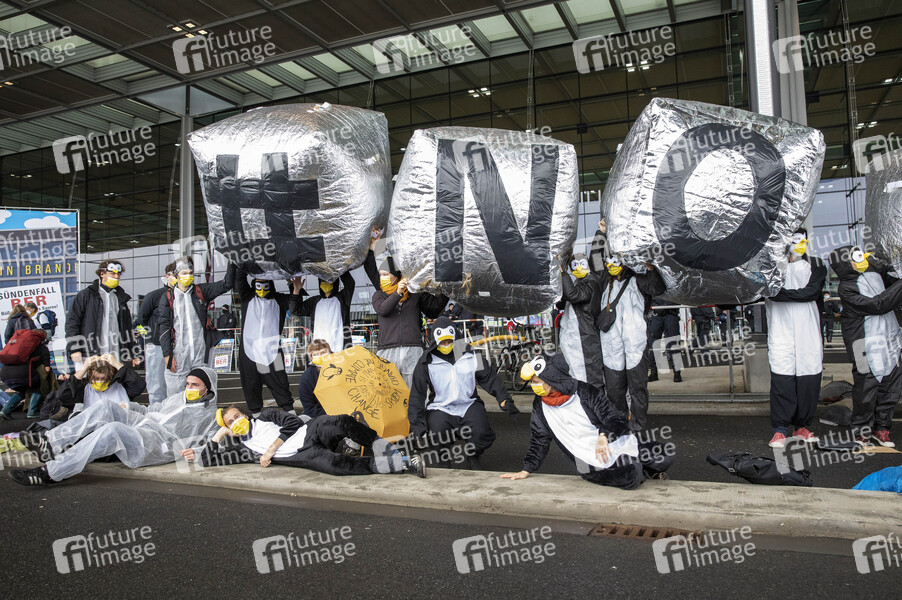 Protestaktionen von Mitgliedern des Bündnisses 'Am Boden bleiben' bei der Eröffnung des Flughafens Berlin-Brandenburg (BER). Schönefeld, 31.10.2020