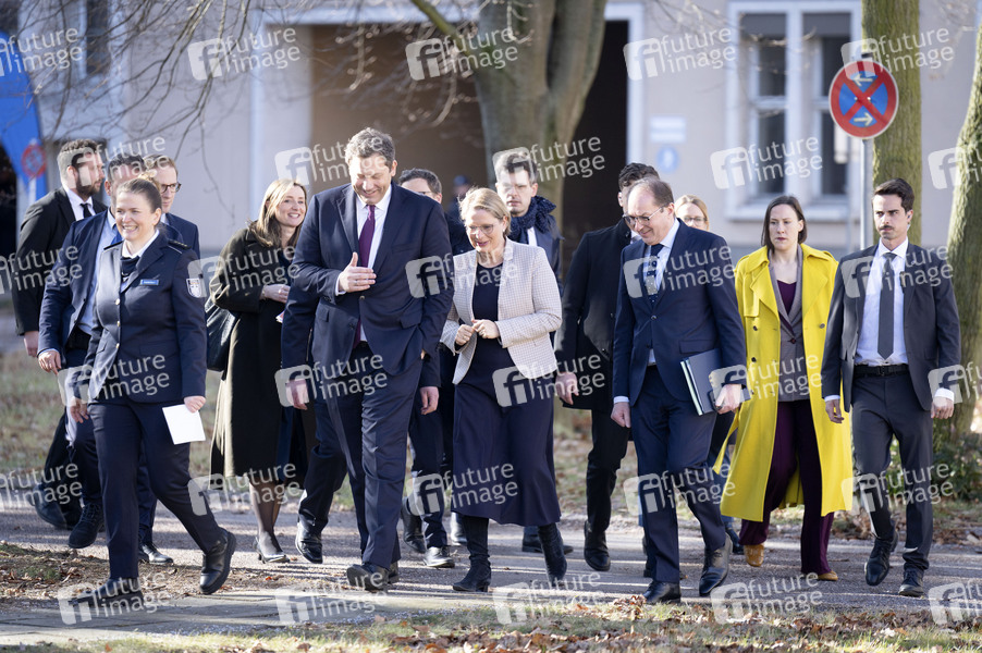 Lars Klingbeil, Stefanie Hubig und Alexander Dobrindt bei der Vorführung eines Zugriffs durch Zoll-Einsatzkräfte nach der Pressekonferenz zur Vorstellung des Aktionsplans gegen Organisierte Kriminalität im Zollfahndungsamt Berlin-Brandenburg. Berlin, 25.02.2026