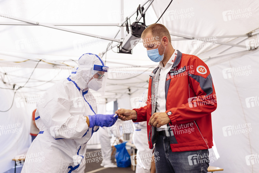 Wegen der Corona-Krise bzw. Corona-Pandemie werden im Corona-Testzentrum am Köln Bonn Airport Reiserückkehrer aus Risikogebieten auf Corona getestet. Köln, 11.08.2020