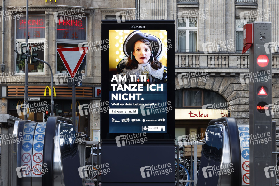Köln ist weiter Corona-Risikogebiet: Inzidenzwert stieg am Samstag auf Inzidenzwert bei 193,9. Im Bild eine Kampagne der Stadt Köln, die Passanten am Kölner Dom auf die coronabedingte Absage offizieller Karnevalsfeiern hinweist. (Themenbild, Symbolbild) Köln, 06.11.2020