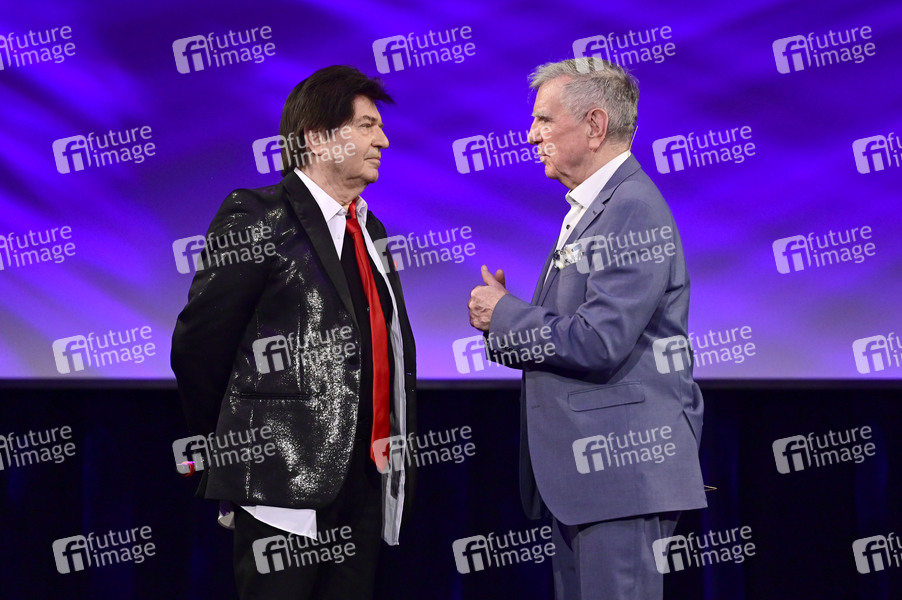 Uwe Jensen und Siegfried 'Siggi' Trzoß bei der Radio-Aufzeichnung der 1000. Sendung 'Kofferradio' im Freizeitforum Marzahn. Berlin, 31.01.2025