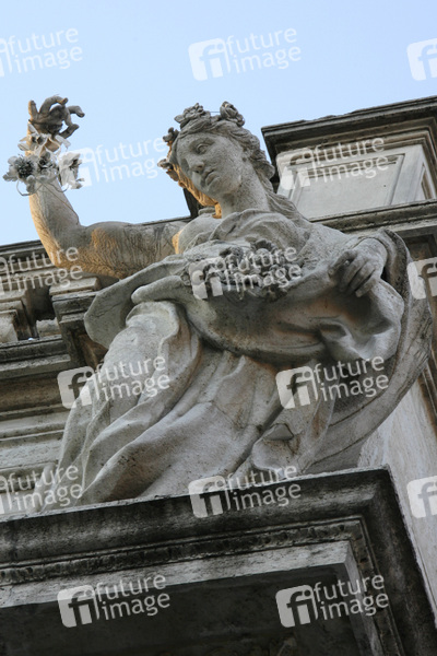 größter Brunnen Roms und einer der bekanntesten Brunnen der Welt, 26 Meter hoch, 50 Meter breit, eingeweiht 1735, besteht aus einer Palastfassade mit Triumphbogen, davor tummeln sich Meeresgestalten auf einer Felslandschaft, Fabelwesen des Meeres, Meerespferde, Tritonen, im Zentrum der herrschaftliche Meeresgott Oceanus