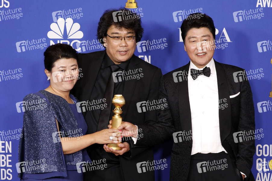 Lee Jung-eun, Bong Joon-ho und Song Kang-ho mit dem Preis für den Besten fremdsprachigen Film 'Parasite' bei der Verleihung der 77. Golden Globe Awards im Beverly Hilton Hotel. Beverly Hills, 05.01.2020