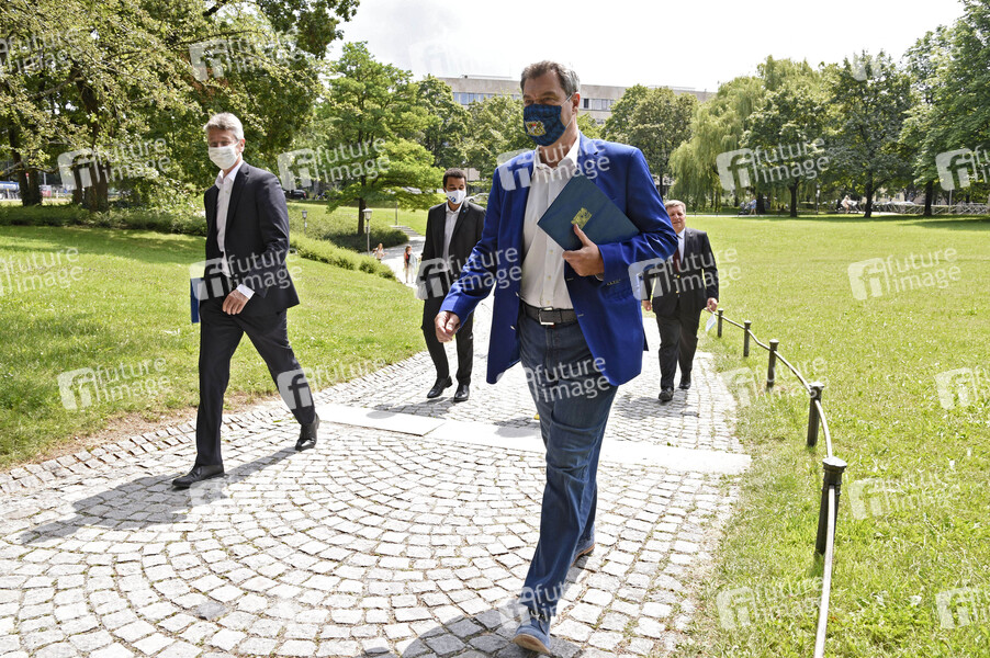 Michael Piazolo und Markus Söder mit Vertretern der Lehrer-Verbände auf dem Weg zur Pressekonferenz zum Schul-Digitalisierungsgipfel im Foyer des Prinz-Carl-Palais. München, 23.07.2020