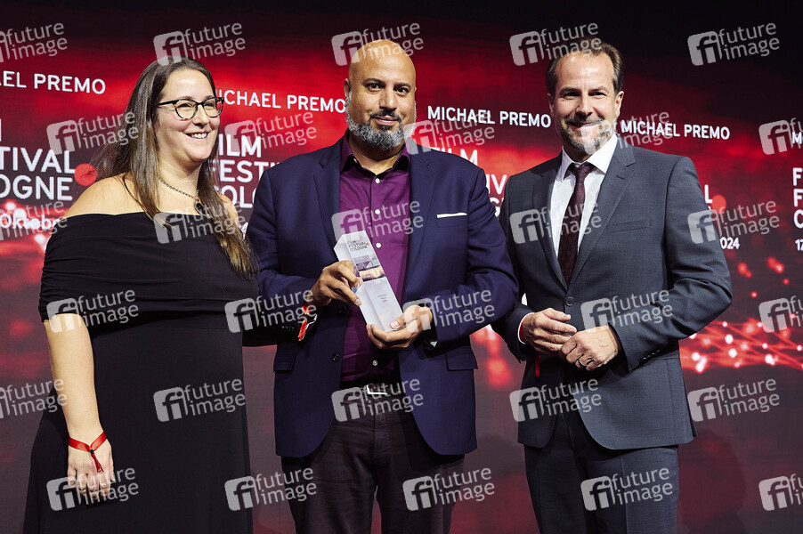 Rachel Falcone und Michael Premo mit Laudator bei der Preisverleihung auf dem 34.Film Festival Cologne 2024 im E-Werk. Köln, 24.10.2024