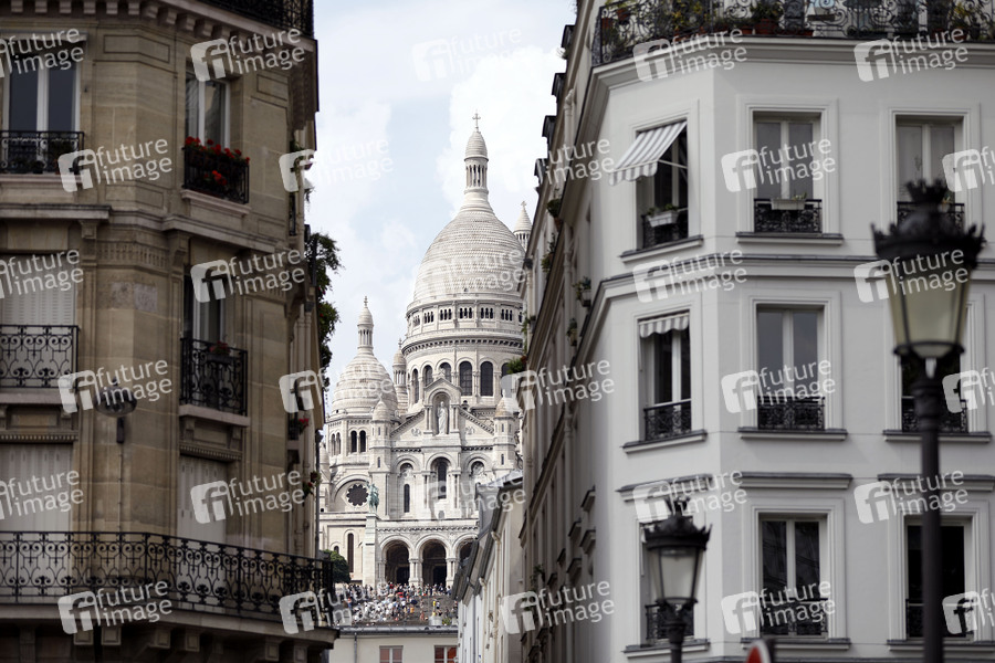 Tourismus, Touristen, Sightseeing, Stadt der Liebe, neobyzantinischer Bau, Architektur, Sommer in Paris, Reiseziel, Frankreich, Kultur, Sacre Coeur, Basilika, Straßenschlucht, Impression, Stadtleben, Stadtbild