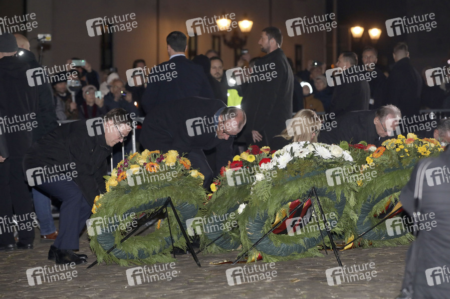 Friedrich Merz, Simone Borris und Reiner Haseloff bei einer Kranzniederlegung in Gedenken an die Opfer ein Jahr nach dem Anschlag auf den Weihnachtsmarkt vor der Johanniskirche. Magdeburg, 20.12.2025