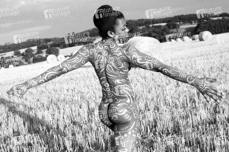 Bodypainting, Erotik, Frau, Mädchen, Afrikanerien, nackt, draußen, weiblich, Körperkunst, Kunst, Ornamente, Malerei, Feld, Acker, Stoppelfeld, Heuballen, Stroh, Landwirtschaft, Ernte, Abendsonne, erotic, African woman, girl, nude, outdoor, female, body art, body painting, ornaments, field, hay, straw, farming, harvest, evening sun