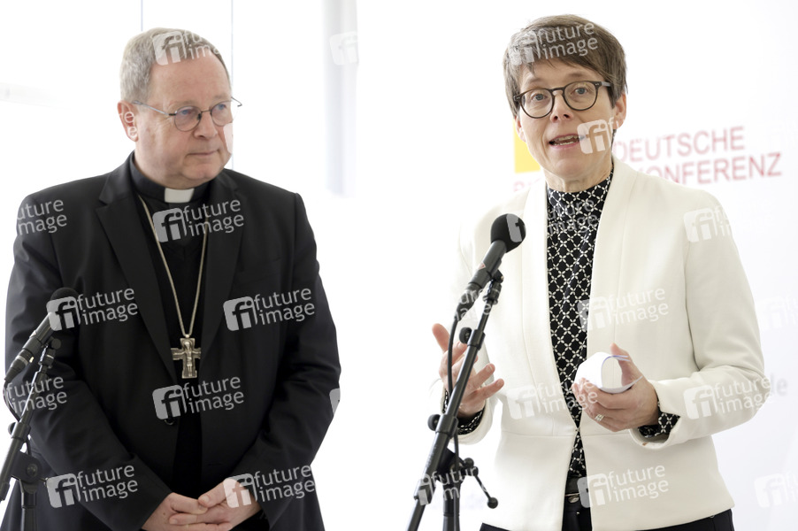 Georg Bätzing und Beate Gilles beim Pressestatement zur Wahl von Heiner Wilmer SCJ zum neuen Vorsitzenden der Bischofskonferenz auf der Frühjahrsvollversammlung im Burkardushaus. Würzburg, 24.02.2026