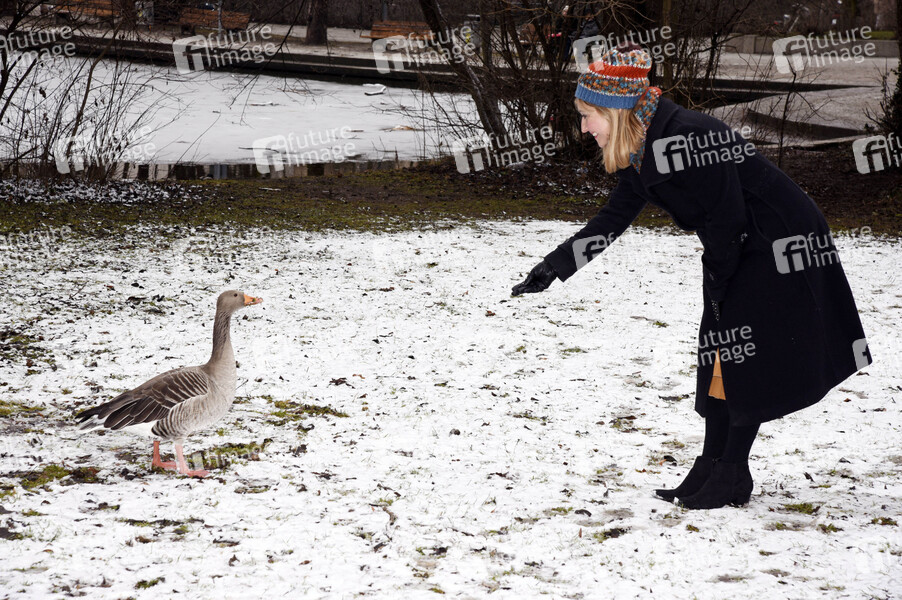 Prominenz, Celebrity, Celebrities, exklusives Fotoshooting, Photoshooting, Fototermin, Unterhaltung, Entertainment, Winter, Schnee, Enten, Ente, Gans, Gänse, Schauspielerin