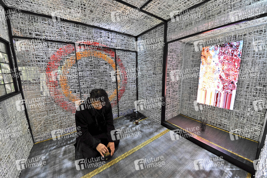 Medienkünstler Yoichi Ochiai serviert einen Tee in seinem gestalteten Teezeremonieraum 'Pla-an' aus Plastik-Spritzgussrahmen von Kunststoffmodellen während der Veranstaltung 'Gundam R Operation'. Der japanische Spielzeughersteller Bandai Spirits begann mit dem Versuch, Materialien aus Kunststoffverpackungen in Gundam-Kunststoffmodellen zu recyceln. Am 1. April 2021 startete das 'Gundam Recycling Project' mit dem Ziel, eine recyclingorientierte Gesellschaft zu bilden, indem die von Fans gesammelten 'Gundam'-Läufer (der Rahmen des Kunststoffmodells) recycelt werden. Die Menge der gesammelten Läufer wird voraussichtlich etwa 10 Tonnen pro Jahr betragen. Daher wurde das Projekt 'Gundam R Operation' mit dem Wunsch gestartet, mehr Menschen auf das 'Gundam Recycling Project' aufmerksam zu machen und das öffentliche Interesse am Recycling durch Gundam und Gunpla zu steigern. Tokio, 19.11.2021